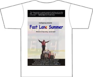 | Love the movie? Wear the shirt! These NEW T-shirts are emblazoned with the Nostalgia Top Fuel racing logo of Jerry Kumre (the driver from the movie) on the front and the Fast Lane Summer movie poster on the back. Sizes Mens Medium to X-Large are available. |